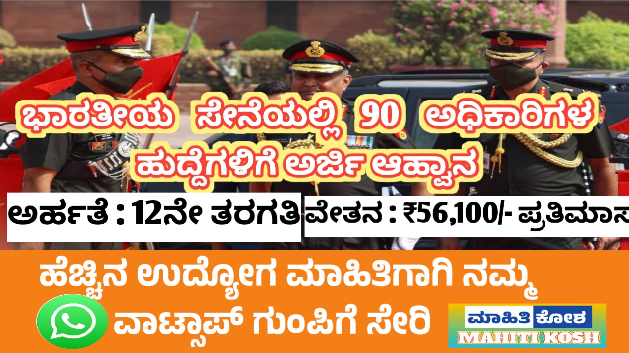ಭಾರತೀಯ ಸೇನೆ (Indian Army) 2025 ರಲ್ಲಿ 10+2 ಟೆಕ್ನಿಕಲ್ ಎಂಟ್ರಿ ಸ್ಕೀಮ್ (TES-55) ಅಡಿಯಲ್ಲಿ ಒಟ್ಟು 90 ಅಧಿಕಾರಿಗಳ ಹುದ್ದೆಗಳಿಗೆ ಅರ್ಜಿ ಆಹ್ವಾನಿಸಿದೆ. ಈ ನೇಮಕಾತಿಗೆ 12ನೇ ತರಗತಿ (Physics, Chemistry, Mathematics) ನಲ್ಲಿ ಕನಿಷ್ಠ 60% ಅಂಕಗಳನ್ನು ಪಡೆದ ಅಭ್ಯರ್ಥಿಗಳು ಅರ್ಜಿ ಹಾಕಬಹುದು.