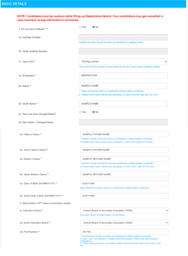 ಗಮನಿಸಿ: ಅಭ್ಯರ್ಥಿಗಳು ನೋಂದಣಿ ವಿವರಗಳನ್ನು ಭರ್ತಿ ಮಾಡುವಾಗ ಜಾಗರೂಕರಾಗಿರಬೇಕು. ತಪ್ಪಾದ/ತಪ್ಪು ಮಾಹಿತಿಯನ್ನು ಒದಗಿಸಿದಲ್ಲಿ ನಿಮ್ಮ ಉಮೇದುವಾರಿಕೆಯನ್ನು ರದ್ದುಗೊಳಿಸಬಹುದು.