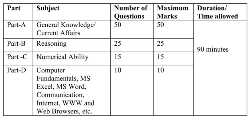 ಕಂಪ್ಯೂಟರ್ ಆಧಾರಿತ ಪರೀಕ್ಷೆ: ಕಂಪ್ಯೂಟರ್ ಆಧಾರಿತ ಪರೀಕ್ಷೆಯು 100 ಅಂಕಗಳನ್ನು ಹೊಂದಿರುವ 100 ಪ್ರಶ್ನೆಗಳನ್ನು ಒಳಗೊಂಡಿರುವ ಒಂದು ವಸ್ತುನಿಷ್ಠ ಮಾದರಿಯ ಬಹು-ಆಯ್ಕೆ ಪತ್ರಿಕೆಯನ್ನು ಒಳಗೊಂಡಿರುತ್ತದೆ, ಈ ಕೆಳಗಿನ ಸಂಯೋಜನೆಯನ್ನು ಹೊಂದಿರುತ್ತದೆ: –