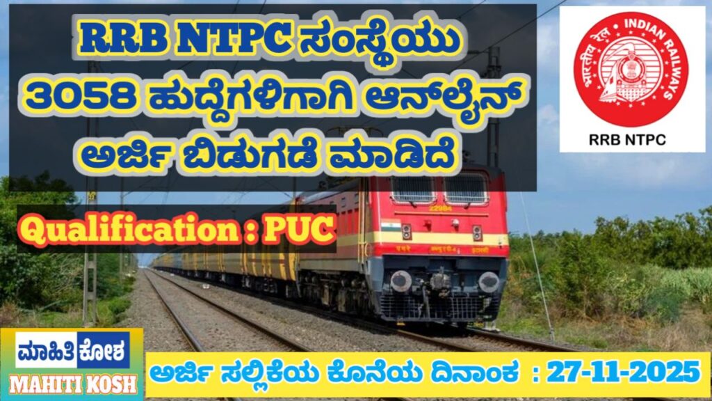 ರೈಲ್ವೇ ನೇಮಕಾತಿ ಮಂಡಳಿ (RRB NTPC)** ಸಂಸ್ಥೆಯು 3058 ಹುದ್ದೆಗಳ ನೇಮಕಾತಿ ಪ್ರಕಟಣೆ  ಮಾಡಿದೆ. ಟ್ರೇನ್ ಕ್ಲರ್ಕ್, ಜೂನಿಯರ್ ಕ್ಲರ್ಕ್ ಕಮ್ ಟೈಪಿಸ್ಟ್ ಮತ್ತು ಇತರ ಹುದ್ದೆಗಳಿಗಾಗಿ ಅರ್ಜಿಗಳನ್ನು ಆಹ್ವಾನಿಸಲಾಗಿದೆ. ಅರ್ಹ ಅಭ್ಯರ್ಥಿಗಳು ತಮ್ಮ ಅರ್ಜಿಯನ್ನು **28 ಅಕ್ಟೋಬರ್ 2025 ರಿಂದ 27 ನವೆಂಬರ್ 2025**ರವರೆಗೆ **rrbchennai.gov.in** ವೆಬ್‌ಸೈಟ್‌ನಲ್ಲಿ ಆನ್‌ಲೈನ್ ಮೂಲಕ ಸಲ್ಲಿಸಬಹುದು.