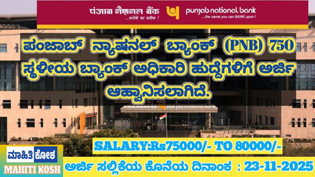 ಪಂಜಾಬ್ ನ್ಯಾಷನಲ್ ಬ್ಯಾಂಕ್ (PNB) 750 ಸ್ಥಳೀಯ ಬ್ಯಾಂಕ್ ಅಧಿಕಾರಿ ಹುದ್ದೆಗಳಿಗೆ ನೇಮಕಾತಿ ಮಾಡಿಕೊಳ್ಳುತ್ತಿದೆ. ಪದವೀಧರ ಅಭ್ಯರ್ಥಿಗಳು ಆನ್ಲೈನ್ನಲ್ಲಿ ಅರ್ಜಿ ಸಲ್ಲಿಸಬಹುದು. ಆನ್ಲೈನ್ ಅರ್ಜಿಯು 03-11-2025 ರಂದು ಪ್ರಾರಂಭವಾಗುತ್ತದೆ ಮತ್ತು 23-11-2025 ರಂದು ಮುಕ್ತಾಯಗೊಳ್ಳುತ್ತದೆ. ಅಭ್ಯರ್ಥಿಯು PNB ವೆಬ್ಸೈಟ್, pnb.bank.in ಮೂಲಕ ಆನ್ಲೈನ್ನಲ್ಲಿ ಅರ್ಜಿ ಸಲ್ಲಿಸಬೇಕು.